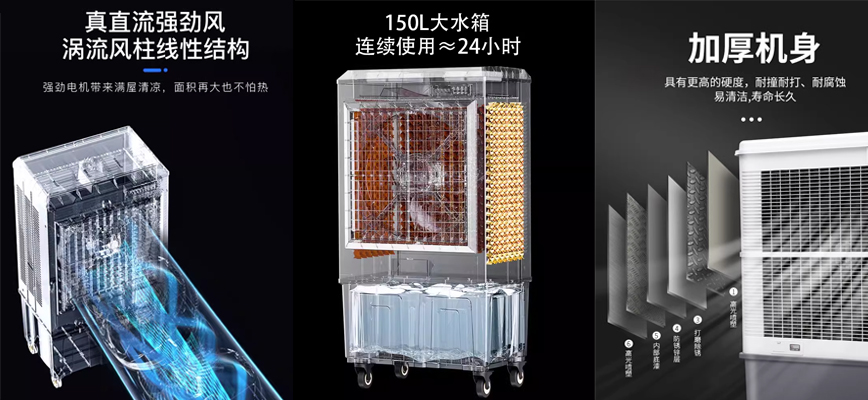 雷豹移動式冷風(fēng)機(jī)MFC16000尤其適合家用/商鋪/網(wǎng)吧/養(yǎng)殖等地方,冷開機(jī)瞬清涼制冷迅速,立即見效,使用7.5厘米植物纖維高蒸發(fā)率加厚冰簾,急速降溫,倍感清涼,30寸尼龍材質(zhì)扇葉采用不易變形的鋁合金軸套,使用壽命長,延長送風(fēng)距離,全方位促進(jìn)空氣對流,700W大功率,功率越大風(fēng)量越大,涼爽整個大空間,超廣角立體送風(fēng),距離高達(dá)18米,大范圍釋放清涼,6級優(yōu)質(zhì)電機(jī)帶來更具性價比的功耗,150L一體式水箱設(shè)計,一次加滿相當(dāng)于300瓶500ML礦泉水,大容量舒適更持久,便捷式旋鈕控制面板,一目了然的面板,簡潔易懂的操作,擁有防掉落的注水口、底部排水口、水位顯示窗、移動萬向輪,強(qiáng)效降溫,倍感清涼。