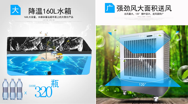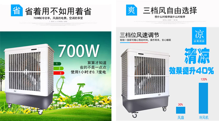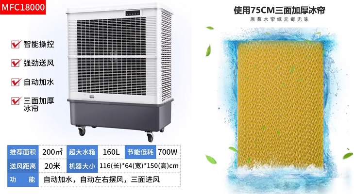 雷豹移動式冷風機MFC18000適合工廠、養(yǎng)殖場、廠房等大型公共環(huán)境,可以應對各種場景通風降溫,密封環(huán)境全屋降溫。使用75CM三面加厚冰簾,原漿水簾紙無毒無味,大面積降溫急速降溫,輕松享受清新空氣;30寸尼龍扇葉,762mm超大增強尼龍材質扇葉,強度高穩(wěn)定扇葉強勁送風,扇葉采用不易變形的鋁合金軸套,三扇渦輪式巨幅扇葉,延長送風距離,全方位促進空氣對流,壽命長;700W超大功率,大于市場普遍功率值,超廣角送風,涼爽整個大空間,確保清涼的氣息充滿房間的每一個角落;優(yōu)質六級電機,以低耗電獲得更強勁的動力,更加省電,可長時間高效運轉時自動待機保護,安全放心;160L水箱制冷一整天免加水;智能觸控簡約便捷,一目了然的面板 簡潔易懂的操作;正面可手動添水,背面自動注水口可連接水管;360度方便移動,前輪帶剎車,防止隨意跑動;可隨時查看水位,方便控制加水,舒適享受清涼夏天。